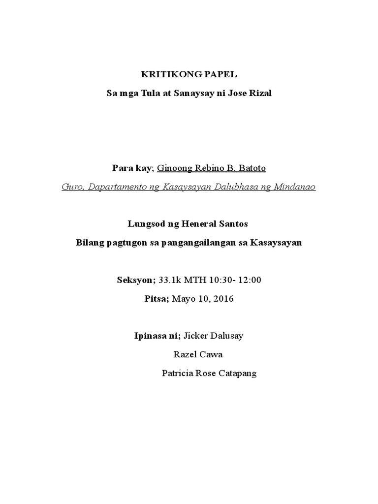 In this novel the society is urged to open its eyes to reality and rebel against the Spanish government. 37 Full PDFs related to this paper. Kritikong Papel Ano ang isang kritikong papel.