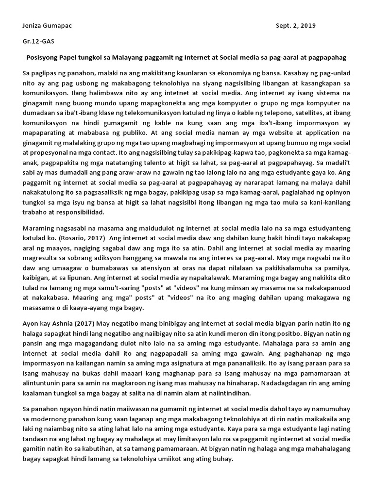 Maaring ito ang magdulot sa iyo ng baagong kaalaman maraming kabataan ang ginagamit ang Social Media upang makapaghanap ng mga impormasyon na kanilang kinakailangan para. Ang isang posisyong papel12 ay isang salaysay na naglalahad ng kuro-kuro hinggil sa isang paksa at karaniwang isinulat ng may-akda o ng nakatukoy na entidad gaya ng isang partido pulitikal. Halimbawa ng posisyong papel 17.