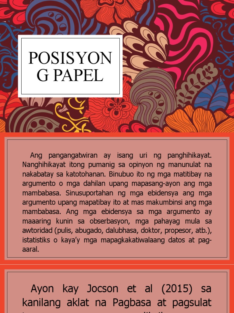 SIMON JANN VALLESPIN GRACE ANN TABLIZO RUDY KENNETH TABLIZO NATHALIE TAYOBANA JOHN VERGEL TAOPO KENN JOSEPH AUSTERO KRISNA JOSHEA OSORIO POSISYONG PAPEL KAHULUGAN LAYUNIN Isang sanaysay na naglalahad ng opinyon Maipakita ang katotohanan at katibayan ng hinggil sa isang usapin karaniwan ng awtor o. View Posisyong-Papel-PPTpptx from CASE 94 at Colegio San Agustin-Bacolod. Ay maaaring maituring na uri ng isang siyentipikong teksto dahil ito ay binubuo ng mga mungkahi at argumento na nabuo dahil sa pananaliksik.