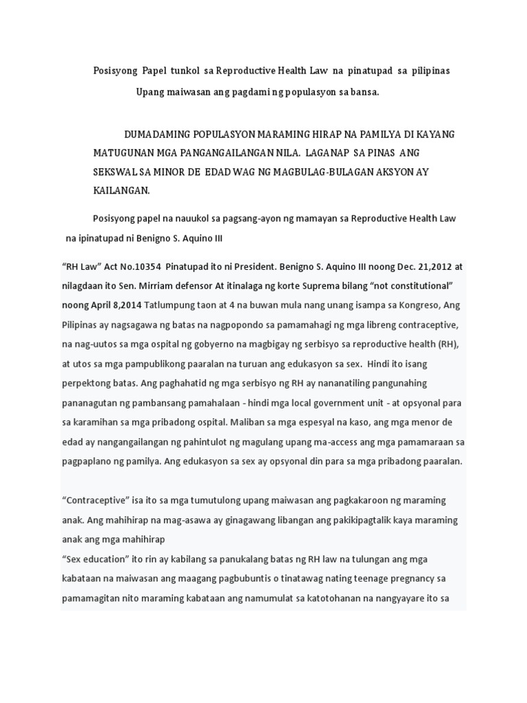 Posisyong Papel Tunkol Sa Reproductive Health Law Na Pinatupad Sa Pilipinas Pdf