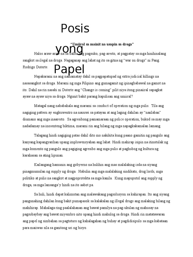 Maraming Pilipino ang nawalan ng mahal sa buhay dahil sa biktima sa giyera kontra droga. POSISYONG PAPEL Paggamit ng Droga. Tell us what you think abut this post by leaving your comments below.